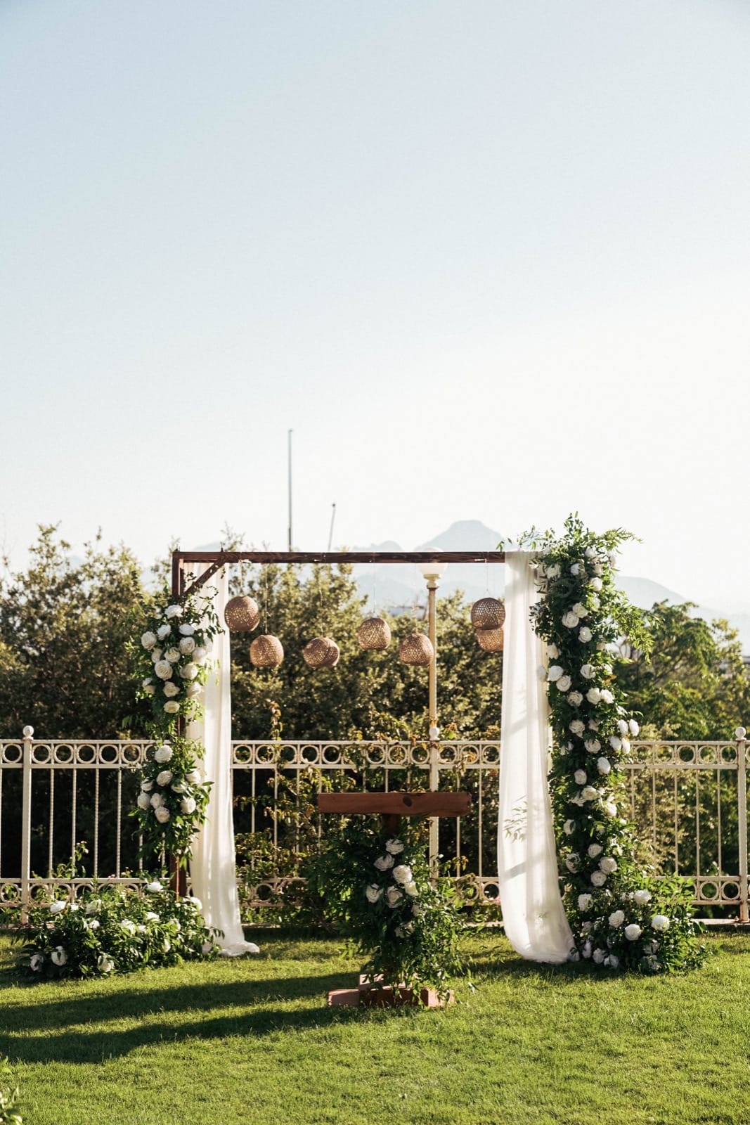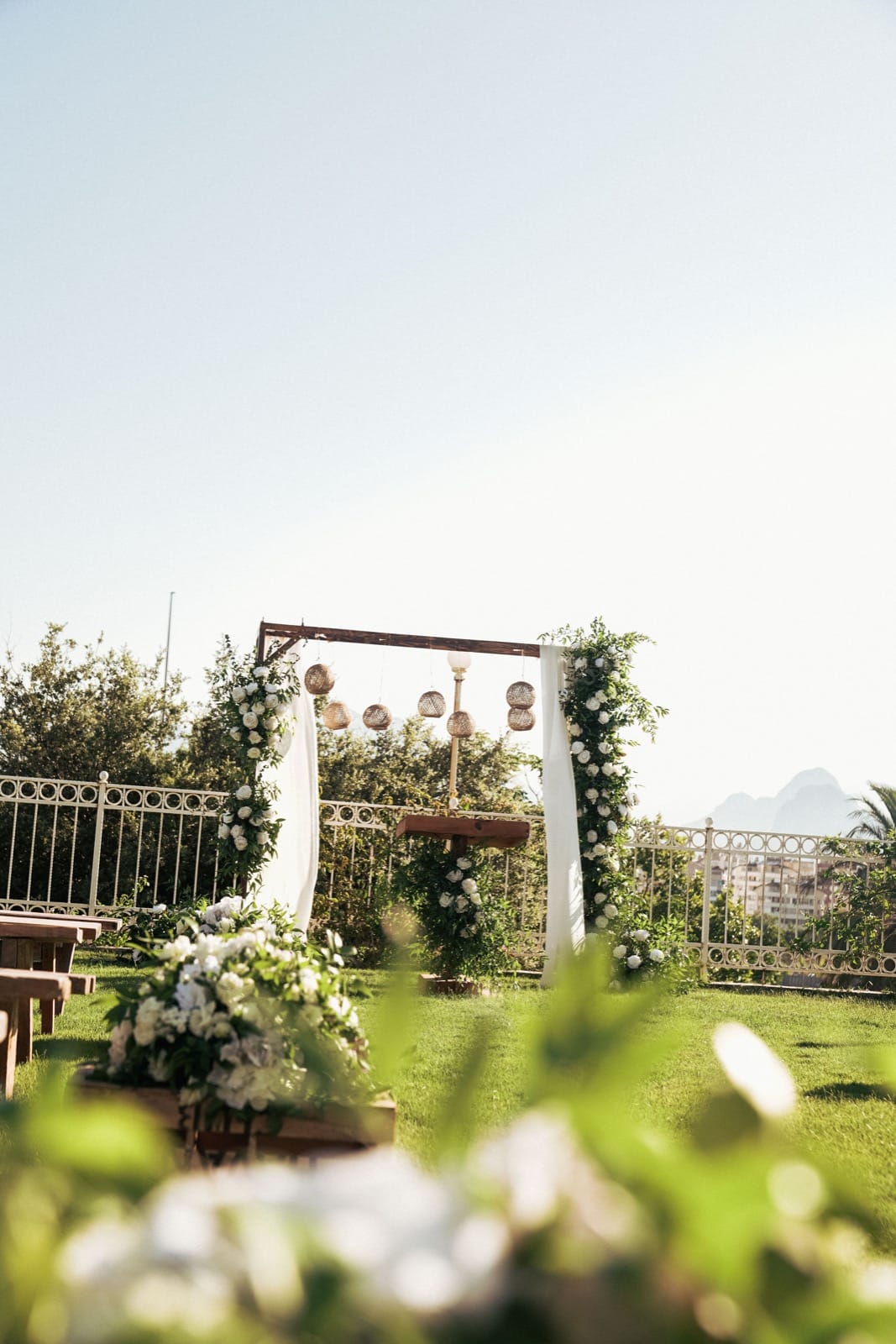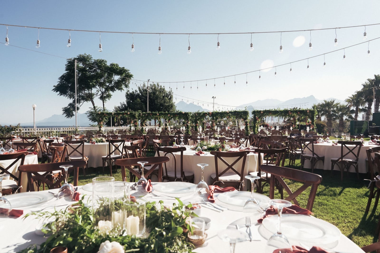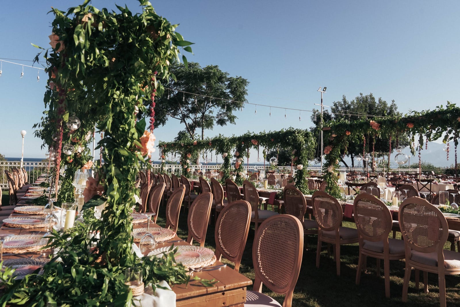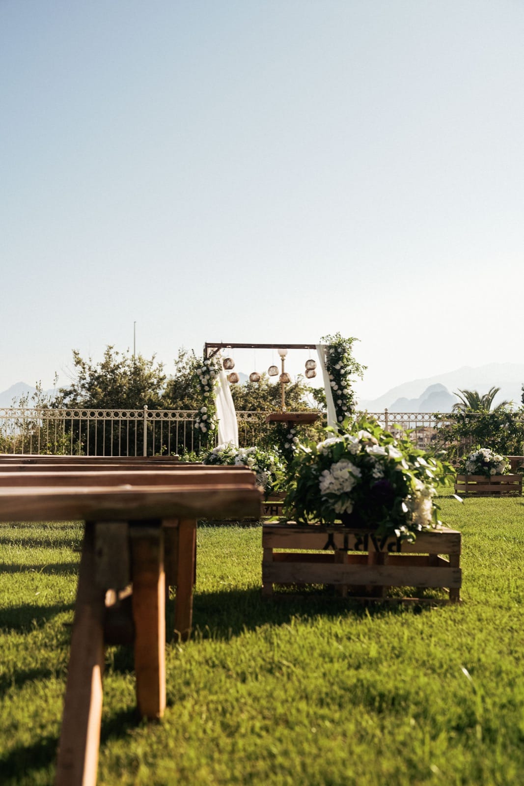 Antalya otel düğün organizasyonu vizyonumuzu en şık haliyle yansıtan bu özel kurulumda, Akdeniz’in turkuaz ruhunu modern ve rustik detaylarla birleştirdik. Misafirleri karşılayan ve kendi atölyelerimizde özel olarak hazırlanan masif ahşap fıçı bistrolar, üzerindeki taze aranjmanlarla hem doğal bir sıcaklık hem de lüks bir Antalya otel düğün organizasyonu için gereken prestijli bir karşılama alanı sunuyor. Seremoni alanının merkezinde yer alan, çiçek atölyemizden çıkan canlı çiçeklerle bezeli tasarım tag, uçuşan beyaz şifon detayları ve hasır sarkıt aydınlatmalarıyla gün batımında adeta büyüleyici bir seremoni ambiyansı yaratıyor.